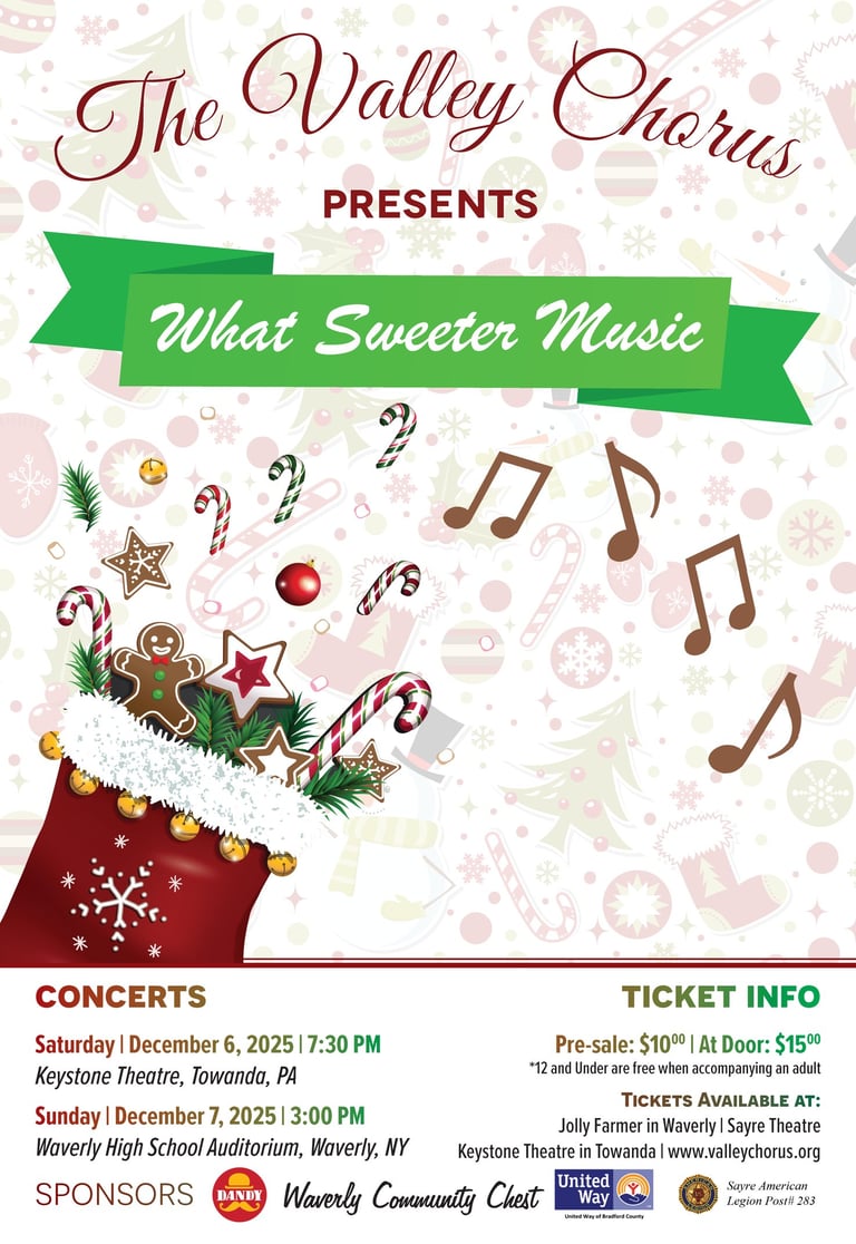 The Valley Chorus presents our 2025 holiday concert: What Sweeter Music. This concert features something for everyone, young and old. We will be singing a mix of holiday favorites and new songs you probably haven't heard. There will be a variety of styles and genres, and we think you'll have a wonderful time. It's a great way to kick off the holiday season.